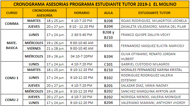 Cronograma de asesorías del Programa Estudiante Tutor 2019-1, a realizarse durante las semanas 13 y 14.