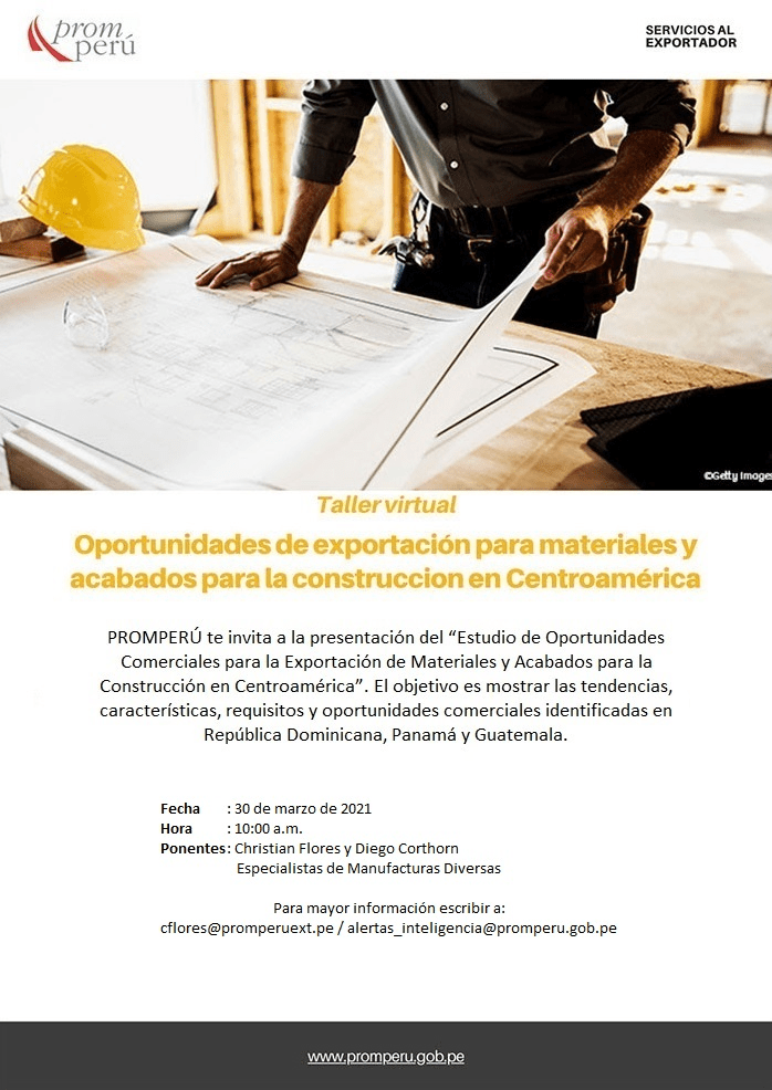 March 28, 2021 Omar Maguiña Rivero Oportunidades de Exportación – Materiales de Construcción Inscripciones en el siguiente enlace: http://rutexins.promperu.gob.pe/registro/evento/7277 Share this: Share on X (Opens in new window) X Share on Facebook (Opens in new window) Facebook Like Loading...