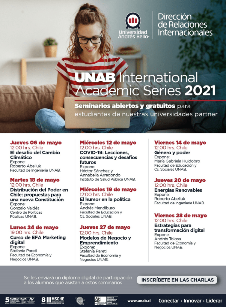 La Universidad Andrés Bello – Chile está invitando a los estudiantes y docentes a ser parte de sus seminarios abiertos. A todos los participantes se le enviará un certificado de participación emitido por UNAB.