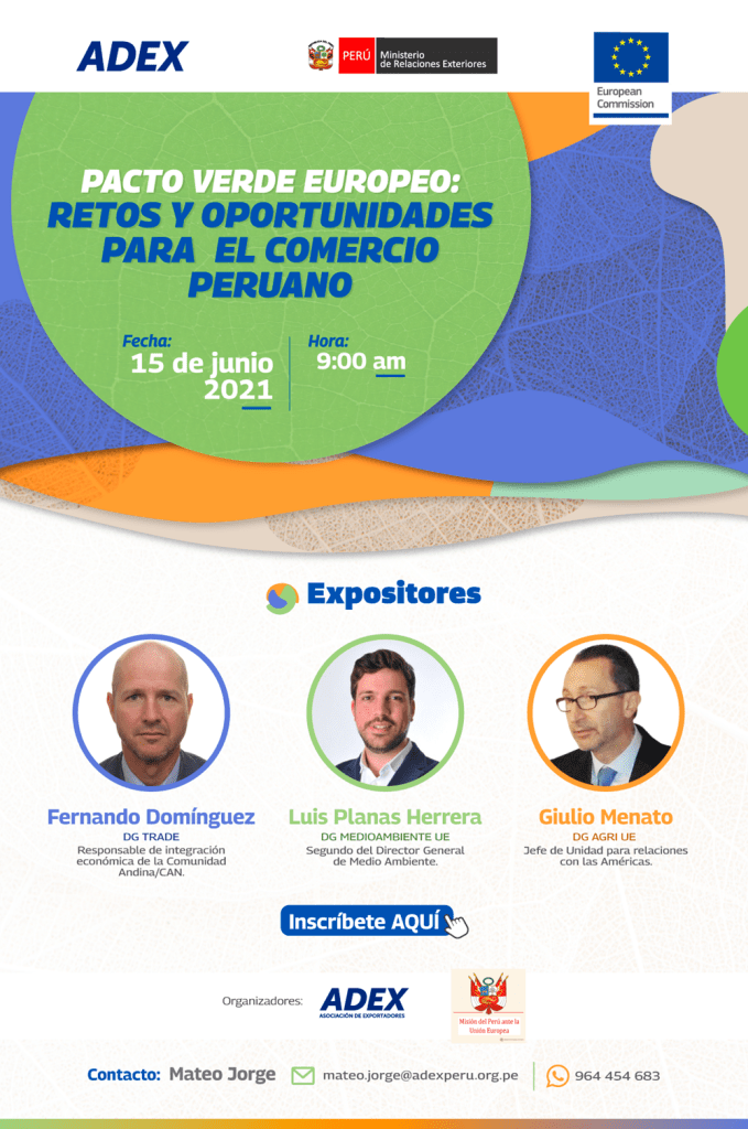May 27, 2021 Omar Maguiña Rivero Pacto verde Europeo: Retos y oportunidades para el comercio peruano Enlace de inscripción: http://contenido.adexperu.org.pe/formularioweb/FrmInscripcion.aspx?var1=2070&var2=1 Share this: Share on X (Opens in new window) X Share on Facebook (Opens in new window) Facebook Like Loading...
